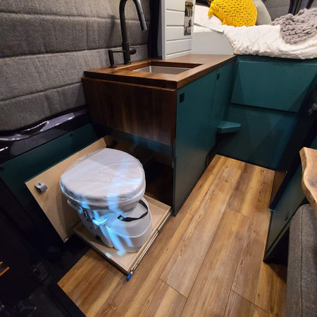 The Holland Dark Dunes was designed for winter adventures for 1-2 people. This van layout features a "living room" style seating, a 2-burner induction cooktop, composting toilet, a bike tray to store an XL mountain bike, gear locker storage drawer, Havelock Wool insulation, custom upholstery, hydronic heating, and loads of storage space. Top-of-the-line Blum hardware is used on all cabinets with slow-closed drawers and modern drawer pulls. A custom roof rack holds 350 Watts of solar, a light bar, and an awning. This van layout is available as part of the semi-custom build program.